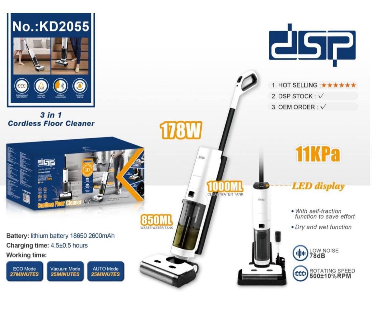 کفشوی بیسیم DSP مدل KD-2055 یک دستگاه چندکاره و مدرن برای نظافت کامل خانه است. این محصول با توان 178 وات، باتری لیتیومی 2600 میلیآمپر و طراحی سبک و بیسیم، به شما امکان میدهد کف خانه را به راحتی جارو کنید، بشویید و حتی با قابلیت خودتمیزشوندگی، نگهداری آسانی داشته باشید. عملکرد کمصدا و هوشمند آن تجربهای راحت و کارآمد برای نظافت روزانه فراهم میکند.
